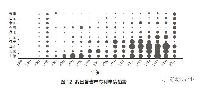 通过中国省市申请趋势可以看出,近年各省市在燃料电池相关领域的申请趋势上都保持了高速增长,但江苏、广东、湖北等省份异军突起,尤其是江苏,在2012、2013、2014、2016、2017年都排在国内前位,如图12所示。
