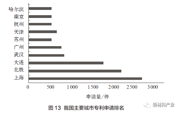 从城市分布来看,上海、北京作为燃料电池车第1批示范城市,研究机构集中、企业聚集度高,申请量最大。大连市的燃料电池专利申请的优势突出,分析其主要原因在于中国科学院大连化学物理研究所以及大连新源动力股份有限公司申请量占比较多。中国科学院大连化学物理研究所作为国内燃料电池领域的重要研究机构,一直作为国家燃料电池方面的科研主力军,先后参与了“八五”、“九五”、“十五”、“十一五”、“十二五”期间承担了诸多国家重点科研项目,突破了多个具有里程碑式的技术难关。大连新源动力股份有限公司,更是成为国内燃料电池产业化的排头兵。