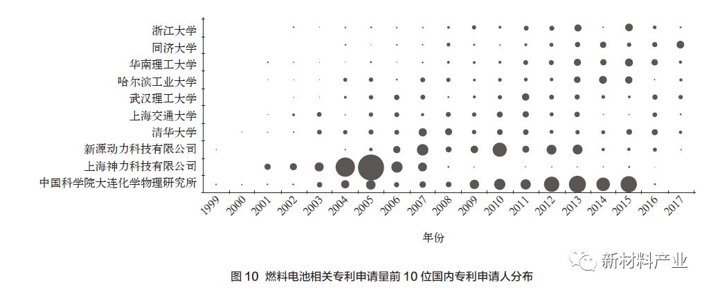 但是从前10位申请人专利申请年限分布看,在专利申请趋势上还是有所加速,见图10。这一定程度上说明国内燃料电池发展虽然起步晚,但后劲十足。不过,由于产业发展都有其周期和规律,当国外企业及研究机构在产业萌发期和爆发期已经做好专利布局后,再想突破难度非常大。因此,国内相关单位应有一定的紧迫感,抓紧进行知识产权布局。