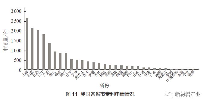 经过燃料电池汽车在2008年北京奥运会期间和2010年上海世博会的示范运行,我国燃料电池行业得到了跨越式发展,清华大学、同济大学、中国科学院大连化学物理研究所、大连新源动力股份有限公司、上海神力科技有限公司等项目主要参与单位的技术水平得到显著提高。这些参与单位主要分布于上海、北京、辽宁,这3省市的专利申请量占比达到国内申请总量的38.5%,详见图11。而具有早期财富积累优势、地理优势、产业集群优势的江苏省,近年来由于政策扶持力度大,吸引了大量创业型公司和相关技术人才,在专利申请量上后来居上超过辽宁省,稳坐国内第3的位置。