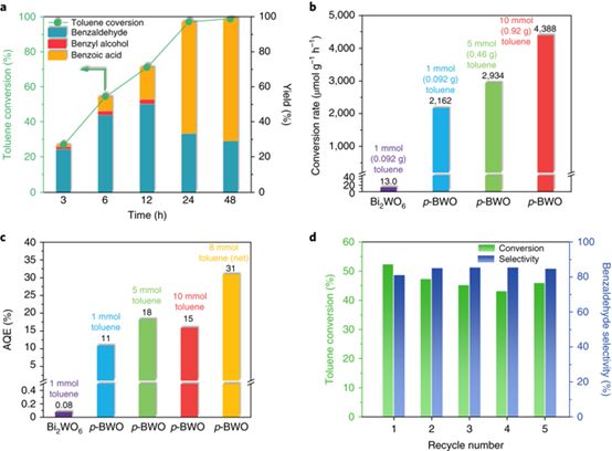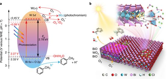 以甲苯光催化氧化作为模型反应,这种新型复合材料的转化率是常规Bi2WO6的166倍。对材料的微观结构分析表明,材料中存在大量W(VI)O6–x单元结构,这些位点促进了光生电子的快速和连续消耗,从而加速电子-空穴对的分离。