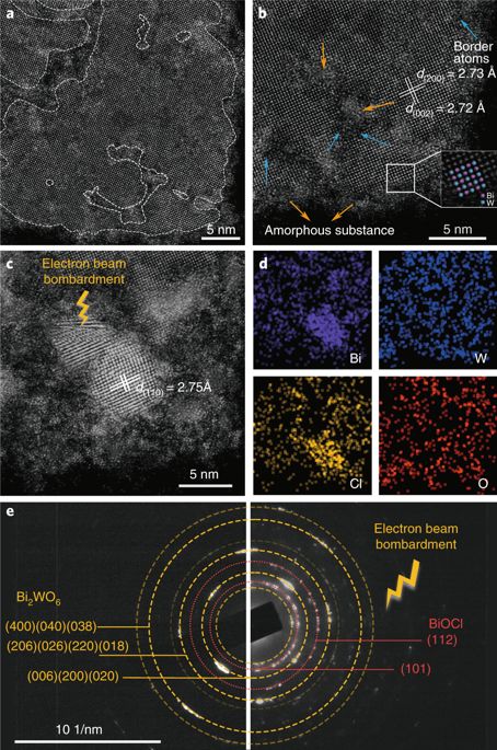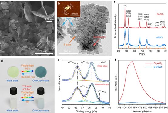 研究人员合成了一种Bi2WO6–x/无定形BiOCl(p-BWO)纳米片。和常规Bi2WO6不同的是,这种纳米片复合材料在可见光照射下呈现出蓝色,并会被空气中的氧漂白。