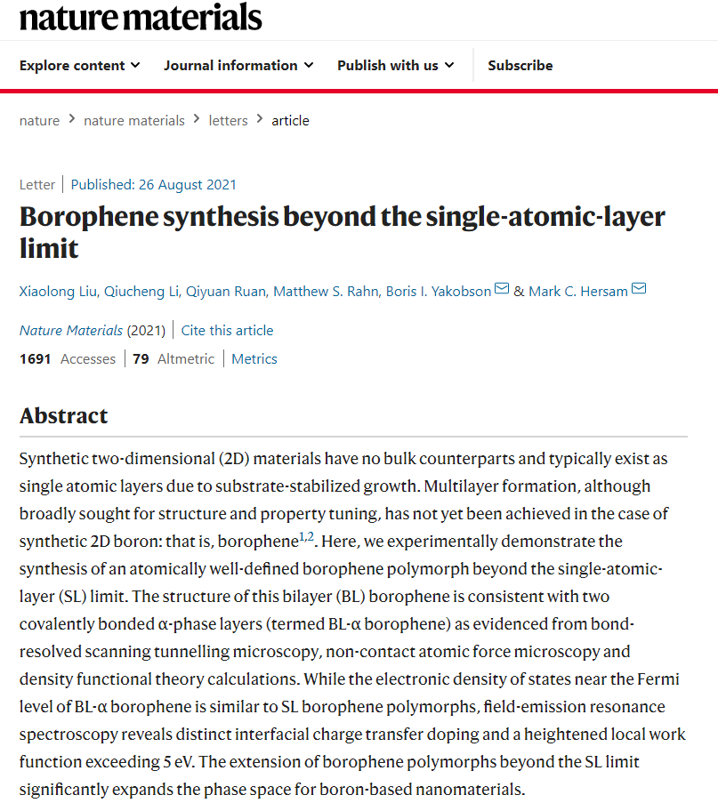 据8月26日发表在《自然·材料》杂志上的最新研究,美国西北大学工程师首次创造出一种双层原子厚度的硼烯,打破了硼在单原子层限制之外形成非平面团簇的自然趋势。