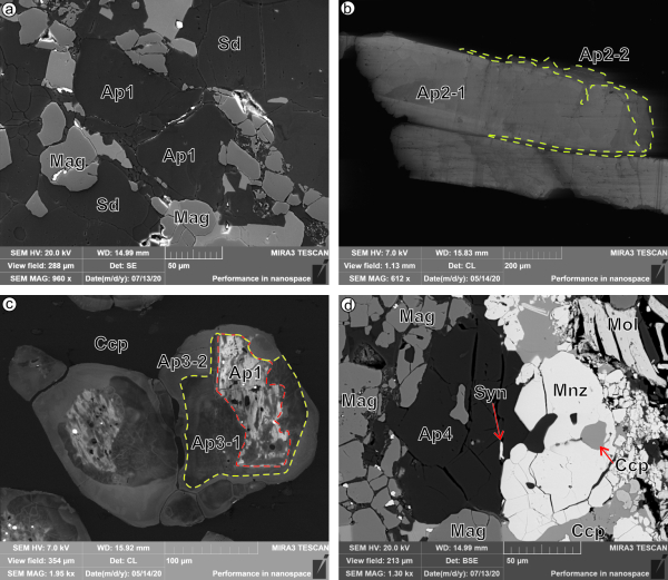 围绕上述问题,中国科学院广州地球化学研究所流体成矿作用学科组助理研究员肖兵和研究员陈华勇及其合作者,对迤纳厂矿床中的磷灰石开展BSE-CL-TIMA、电子探针和LA-ICP-MS分析工作。结合已有认识,研究发现:(1)迤纳厂矿床可分为钠-铁蚀变、铁(稀土)矿化和铜-金-稀土矿化三个阶段,并形成四种不同类型磷灰石。其中,Ap1稀土含量最高,形成于铁(稀土)矿化阶段,与幔源岩浆相关;Ap2和Ap3形成于铜-金-稀土矿化早期阶段,其中Ap2含有最低的稀土含量,形成于铜-金-稀土矿化早期阶段的岩浆热液流体,Ap3形成于Ap1溶解-再沉淀过程中,与相对氧化的热液流体相关;Ap4形成于铜-金-稀土矿化晚期阶段,含有最高的Eu正异常和Eu含量,形成于相对还原的热液流体。(2)Ap3和与Ap4共生的独居石LA-ICP-MS定年结果表明,迤纳厂矿床富稀土磷灰石(Ap1)稀土元素活化迁移发生在900–840 Ma。(3)迤纳厂矿床最显著的特征是富含稀土磷灰石经过后期热液流体的改造,其中的稀土元素可以在磷灰石内部形成稀土矿化,并能远距离迁移,形成脉状矿化。