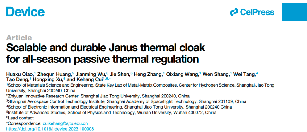 相关研究论文“Scalable and durable Janus thermal cloak for all-season passive thermal regulation”于7月11日在线发表于Device期刊,并将于7月正式发表于该期刊的创刊号上(图4)。Device期刊是Cell 出版社旗下刊物Cell, Joule, Chem, Matter的新姊妹刊,面向多学科交叉性的应用技术研究成果,促进科研领域的创新整合与交叉融通,发表具有现实意义且能够提高人们生活质量的新设备和新器件。该论文上线后得到了New Scientist, Science News, EurekAlert!, Physics World等科技与科普媒体的同步报道。