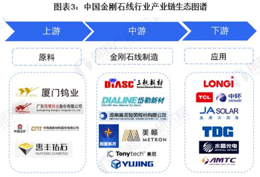 金刚石线上游主要有厦门钨业、翔鹭钨业等母线材料供应商以及惠丰钻石等金刚石微粉供应商;中游金刚石线生产企业主要有美畅股份、岱勒新材、恒星科技等;下游金刚石线应用企业有隆基绿能、TCL 中环、天通股份、水晶光电等。