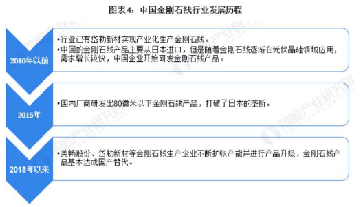 2010年以前,虽然有岱勒新材实现产业化生产,但是金刚石线仍依赖日本进口。随着金刚石线在光伏晶硅切割方面的逐渐应用以及中国光伏产业的发展,金刚石线的需求增长,国内企业开始自主研发金刚石线产品。2015年,国内多家企业已经能够生产80微米以下产品,打破了日本的技术垄断。中国光伏产业的大幅发展也推动了金刚石线生产企业的研发和创新,2018年以来,几大金刚石线生产企业产能拓张,技术升级,国产金刚石线产品逐渐替代进口产品。