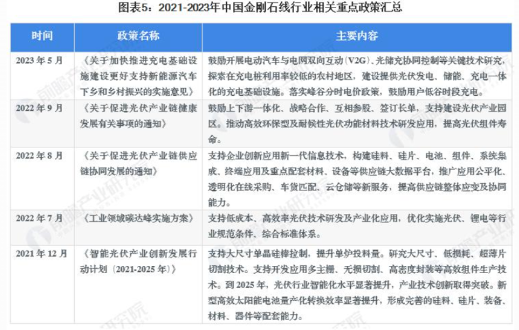光伏行业目前是金刚石线最主要的应用领域,金刚石线切割技术提升了晶硅利用率,降低了企业的成本。2021 年,《智能光伏产业创新发展行动计划 ( 2021-2025 年 ) 》提出支持超薄片切割技术发展,完善光伏行业配套产业。近年来,国家颁布多项政策支持光伏行业的发展,推动金刚石线的需求进一步增长。2021-2023 年中国金刚石线行业相关重点政策汇总解读如下: