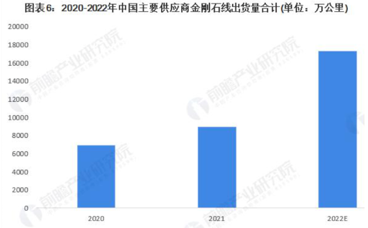 2020 年,中国金刚石线主要供应商出货量在7000万公里左右。随着中国光伏硅片产量增长,金刚石线出货量也保持增长,2021年主要供应商出货量接近9000万公里。初步统计,2022 年出货量在1.7亿公里以上。