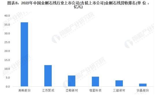 2022年,中国金刚石线上市公司 (含拟上市公司)中,美畅股份金刚石线业务以36.2亿元的营收规模位列中国主要金刚石线上市公司之首。江苏聚成金刚石线营收规模达到12.1亿元,位列第二。岱勒新材和恒星科技金刚石线营收也均超过5亿元,仅次于江苏聚成。