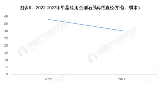 根据中国光伏行业协会数据,2022年多晶硅用金刚线母线直径为 57微米,单晶硅用金刚线母线直径为38微米,已经处于较细的状态。未来,金刚线母线直径仍有下降的空间,但是下降幅度将趋缓,中国光伏行业协会预测,到2027年左右单晶硅用金刚线母线直径将下降到30微米左右。