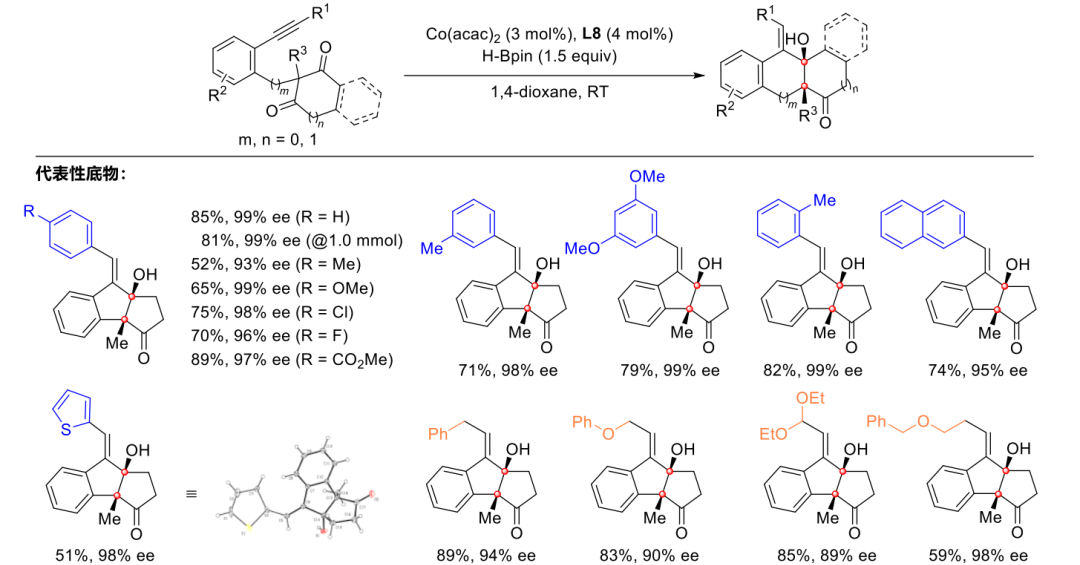 基于此,浙江工业大学贾义霞/梁仁校团队发展了钴-HBpin催化体系,以Ph-(S,Sp)-Phosferrox为手性配体,通过炔基环二酮的催化不对称去对称化还原环化反应,高对映选择性地构筑了一系列多环烯丙醇衍生物,构建连续季碳手性中心。该反应条件温和,具有良好的底物适用范围和官能团容忍性。一系列芳基、烷基、缩醛、醚、酯基及酰胺等取代基均能兼容于反应条件,以中等至良好的收率和普遍优异的对映选择性获得[6-5-n]手性并环化合物。放大规模反应也能保持同一水平收率和ee值。