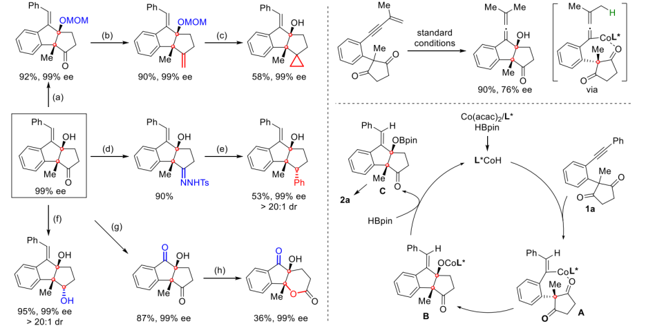 所得产物能基于酮羰基及碳碳双键的选择性转化,获得一系列结构多样性的手性多环化合物,产物ee值均能得到保持。此外,控制实验表明反应可能经历CoH催化机理。