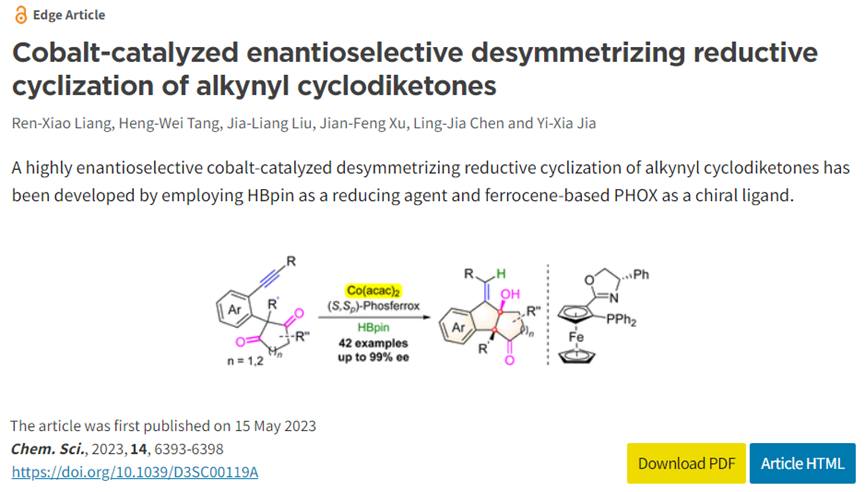 该成果以“Cobalt-Catalyzed Enantioselective Desymmetrizing Reductive Cyclization of Alkynyl Cyclodiketones”为题发表于英国皇家化学学会旗舰期刊《Chemical Science》。论文通讯作者为梁仁校副教授和贾义霞教授,该研究工作得到了国家自然科学基金和浙江省自然科学基金的资助。