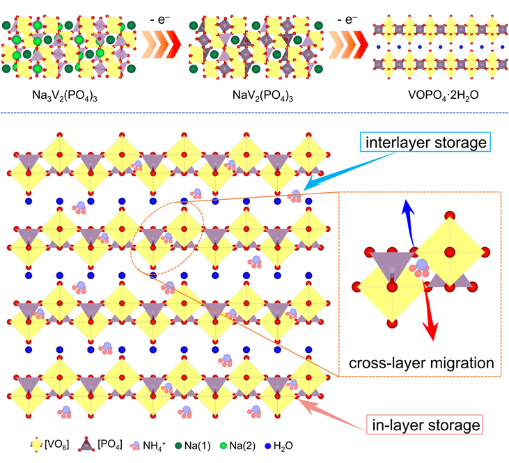 非金属离子(如NH4+)作为载流子在水系二次电池中展现出快速的动力学传输和优异的倍率能力,其小水合离子尺寸(3.31 Å)和独特的拓扑化学性质使其具有广阔的应用潜力。目前已有多项研究专注于铵离子储存材料,其中具有隧道和层状结构的过渡金属化合物引起了广泛关注。然而,大多数关于层状材料的研究都集中在层间氢键的扩散机制上,而忽略了层内结构的功能。事实上,通道也存在于层上,类似于材料的层内隧道。也就是说,铵离子不仅可以沿着层间迁移,还可以在层内进行跨层转移。因此,重新评估层内通道在铵离子储存和迁移过程中的作用具有重要意义。