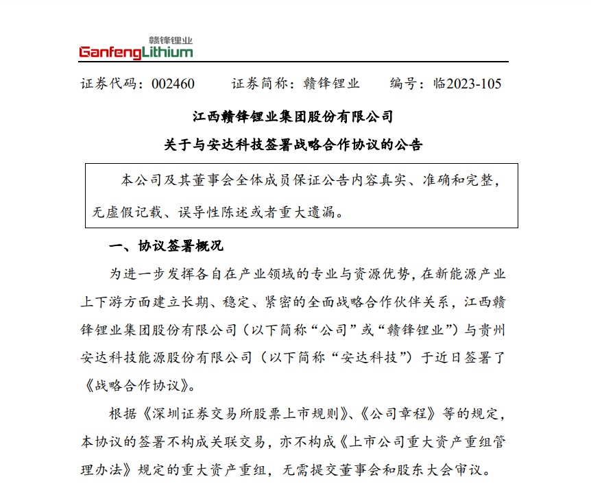 10月16日,赣锋锂业发布公告称,公司与贵州安达科技能源股份有限公司(简称“安达科技”)于近日签署了《战略合作协议》。公告显示,双方将开展多领域合作,在锂盐产品供应方面开展供应链深度合作;在磷酸铁锂正极产品供应方面开展供应链深度合作;拓展锂盐产品的应用领域,在新产品开发、应用研究等领域开展合作。同时,为进一步提升双方的产业竞争力,赣锋锂业和安达科技基于各自的产业优势,拟共同成立合资公司以投资建设年产2万吨磷酸铁锂正极材料制造项目。合资公司注册资本5000万元人民币,赣锋锂业持股40%,安达科技持股60%。