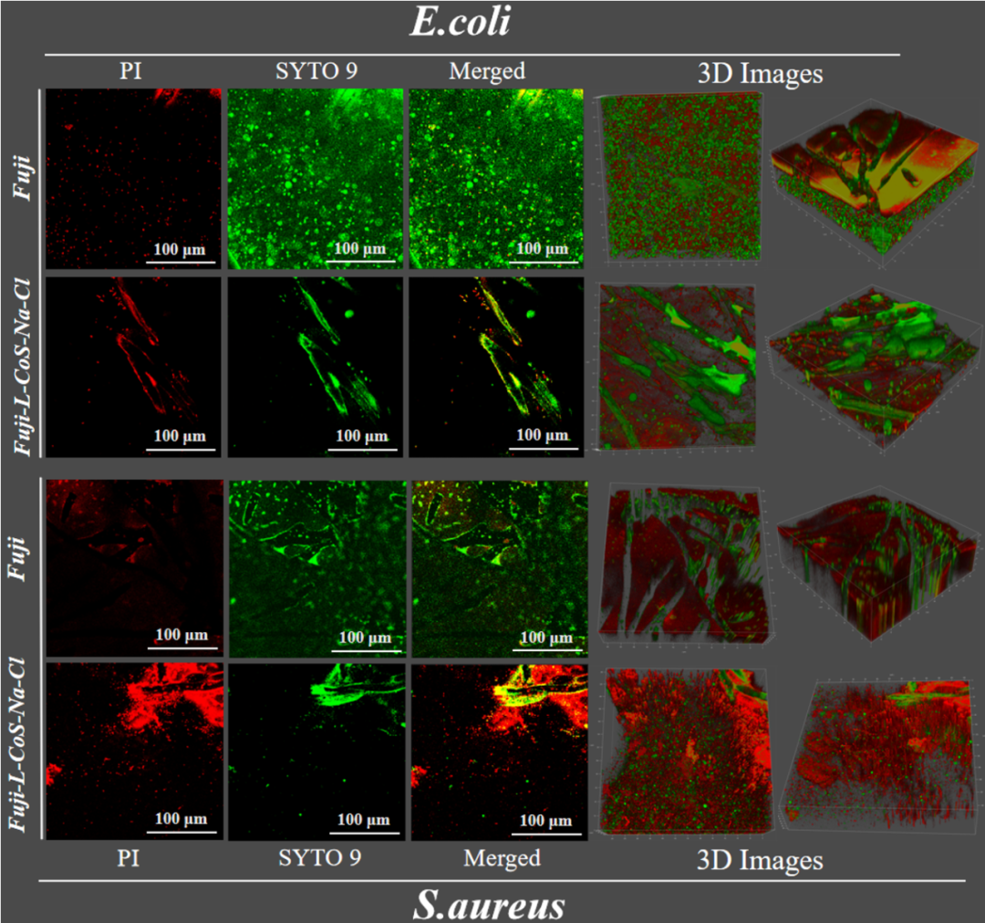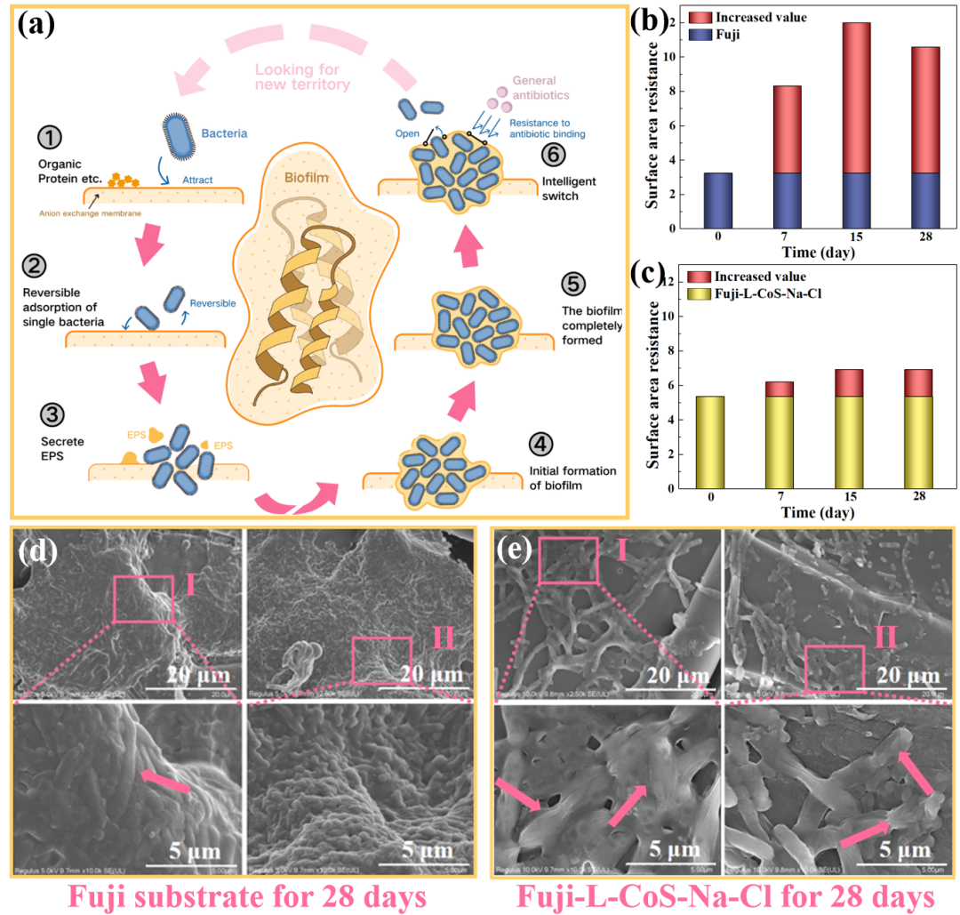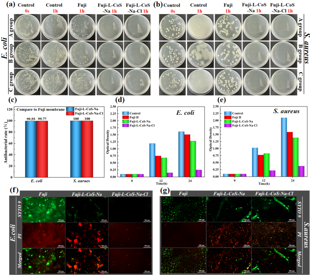 本文采用ASTM E2149和荧光显微镜法对改性前后AEMs的抗菌性能进行测试,改性后的Fuji-L-CoS-Na-Cl膜对大肠杆菌和金黄色葡萄球菌均有较高的抑菌性能,抑菌率均达到99%。采用激光共聚焦显微镜法对原膜Fuji和Fuji-L-CoS-Na-Cl定性分析生物膜累积,3D图像显示原膜活菌数量大于死菌数量,且生物膜厚度增加。由于膜表面的界面自由能的增加细菌难以吸附的基础上,N-Cl键的氧化和Co NPs的接触增强了抗生物膜的形成性能。