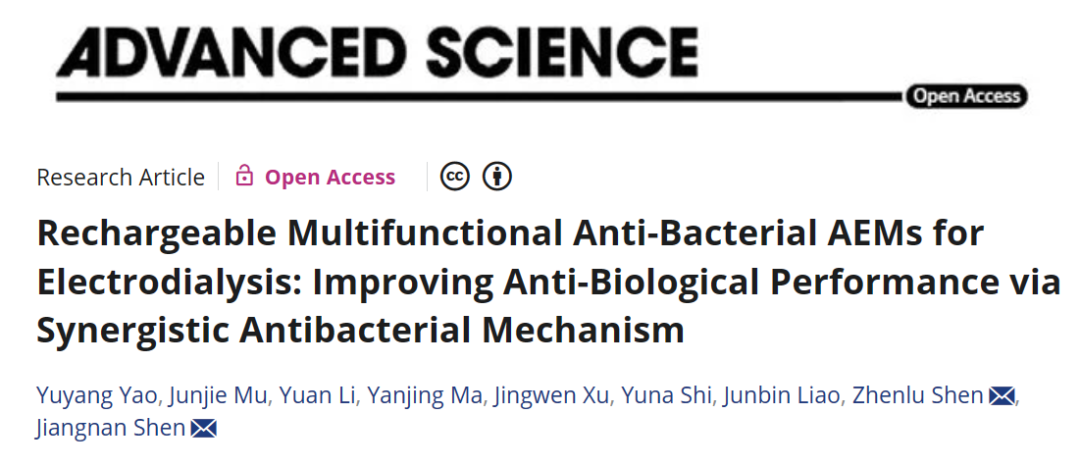 相关研究成果以“Rechargeable Multifunctional Anti-Bacterial AEMs for Electrodialysis: Improving Anti-Biological Performance via Synergistic Antibacterial Mechanism”为题发表于期刊《先进科学》(Advanced science),论文第一作者为浙江工业大学化工学院2022级博士研究生姚宇洋,通讯作者为化工学院沈江南教授和沈振陆教授。研究得到了国家自然科学基金的资助。