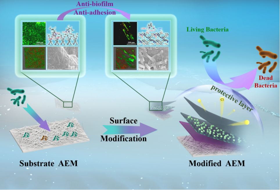 生物污染是影响聚合物膜高分离性能和长期稳定性的重要障碍之一,设计抗菌阴离子交换膜(AEM)在生物医药领域具有重要的研究意义和应用潜力。实现该技术的关键是设计界面抗菌功能层抑制生物污染。