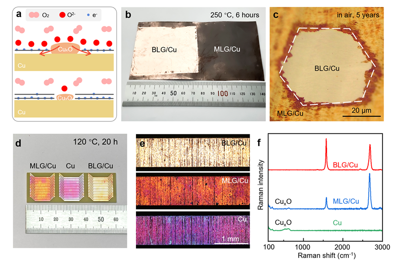 铜因其优良的物理性质(高导电性、高导热性等)而广泛应用于电力电子、半导体工业之中。但是,铜易受腐蚀的特性极大限制了其高端应用的开发,例如,当暴露在200℃的空气中仅30分钟后,铜导线的电导率就会下降99.99999%。目前,人们普遍使用传统的有机涂层法或牺牲阳极法等对铜进行保护,但是,这些方法通常依赖于较厚的涂层,难以满足高端器件微型化的需要。石墨烯因在单原子层厚度上具备优异的防渗透能力和极高的化学稳定性,被认为是金属保护涂层的重要备选之一。然而,石墨烯-金属体系通常具有弱的界面耦合作用和强的表面电化学活性,有研究表明,在长时间、高湿度的环境下,石墨烯甚至会加速铜的腐蚀。因此,亟需开发一种能有效阻断界面扩散和电化学腐蚀的原子级防腐技术,为下一代高端电子产业中铜的应用开辟道路。