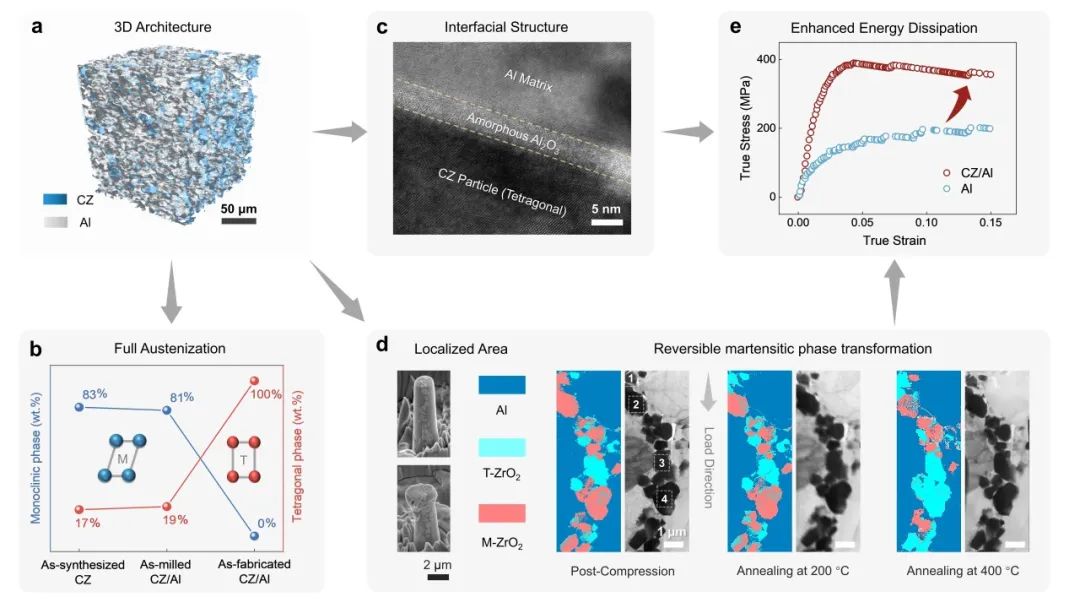 图1 可逆相变陶瓷诱导高能耗金属基复合材料(CZ/Al)原理图。(a)高分辨率X射线显微成像(XRM)的三维结构。(b)复合材料的相组成,其中T和M分别代表四方(奥氏体)和单斜(马氏体)结构。(c)复合界面的高分辨透射电子显微镜(TEM)图像。(d)复合材料局部区域的微柱压缩前后形貌照片,以及TEM样品切片在压缩后(25℃)、200℃和400℃退火后的旋进电子衍射(PED)明场图像和对应的相组成图。压缩方向(从上到下)由箭头指示。(e)复合材料与纯铝压缩过程的真应力-真应变曲线。