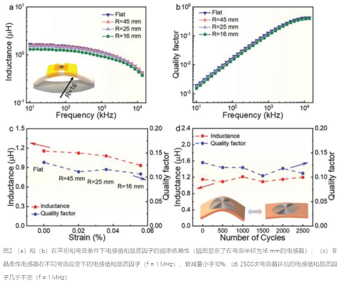 近期,中国科学院宁波材料技术与工程研究所非晶合金磁电功能特性团队在王军强研究员的指导下,基于铁基非晶软磁合金的优异性能,利用高精度飞秒激光烧蚀技术,在抑制非晶合金晶化的前提下,制备得到了非晶柔性微型电感器(如图1)。该柔性电感器具有优异的机械柔韧性和非常高的变形稳定性,可承受大于5 mm的拉伸变形量(自身尺寸的3倍,如图1e-g),当弯曲半径为16 mm时,电感值和品质因子衰减小于10%,2500次弯曲实验之后性能依旧(如图2)。同时,在1MHz时其电感密度高达280-390 nH/mm2,是传统平面电感器的10倍左右(如图3),并且相较于传统的铜等非磁性材料,减少了漏磁现象,漏磁小于10-4 T(如图4),可极大减少电子元器件之间的干扰。